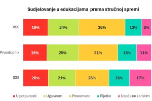 U Hrvatskoj je taj udio nešto niži te je manje od polovice (48 posto) radnika sudjelovalo u edukacijskim programima. Zaposlenici u Hrvatskoj programe za stručno usavršavanje uglavnom prihvaćaju s entuzijazmom. Gotovo polovica ispitanika (43 posto) u potpunosti ili većinom iskoristi ponuđene edukacije, 32 posto sudjeluje povremeno, 14 posto rijetko, a 11 posto uopće se ne koristi prilikama za profesionalni razvoj. Gotovo polovica zaposlenika koji su sudjelovali u istraživanju na usavršavanje gleda ne samo kao na obvezu prema poslodavcu, već i kao na priliku za razvoj novih vještina i otvaranje novih karijernih mogućnosti. Taj je pristup posebno izražen u Češkoj i Slovačkoj, gdje gotovo 60 posto zaposlenika ulaže u edukacije kako bi poboljšali svoje šanse za napredovanje.