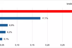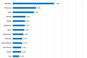 Od ukupne vrijednosti realiziranog globalnog uvoza kave u 2024. godini, najveći udio zauzima SAD, i to u iznosu od 17,4 posto (slika 6.). Slijede ga Njemačka s udjelom od 11,8 posto i Francuska s udjelom od 6,6 posto.