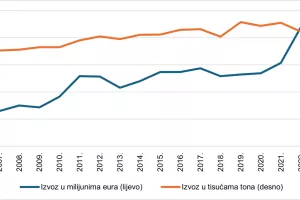 Da bi se neutralizirao učinak rasta cijena, uz nominalni uvoz analiziran je realni uvoz kave. Dobiveni rezultati prikazani su na slici 3. Pritom je nominalni uvoz kave mjeren na lijevoj osi slike 3. i izražen je u milijunima eura, dok je realni uvoz kave mjeren na desnoj osi i izražen je u tisućama tona.