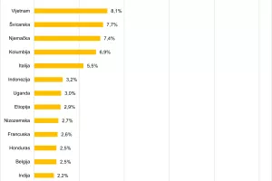 Globalni izvoz kave je u 2024. godini dosegnuo vrijednost od 47,6 milijardi eura. Pritom je 22,1 posto izvoza realizirao Brazil, 8,1 posto Vijetnam, 7,7 posto Švicarska i 7,4 posto Njemačka (slika 5.).