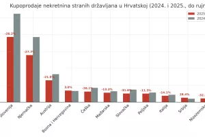 Strani državljani su u prvih devet mjeseci 2025. kupili znatno manje nekretnina u Hrvatskoj nego u istom razdoblju prošle godine, pokazuju najnoviji podaci Porezne uprave. Ukupno su stranci kupili oko 6592 nekretnine, što je oko 1900 manje nego lani u prva tri kvartala, odnosno pad od približno 22 posto. Pad je izražen u gotovo svim državama, pa i kod tradicionalno najaktivnijih kupaca: Nijemaca, Slovenaca i Austrijanaca.
